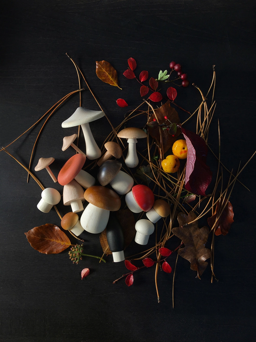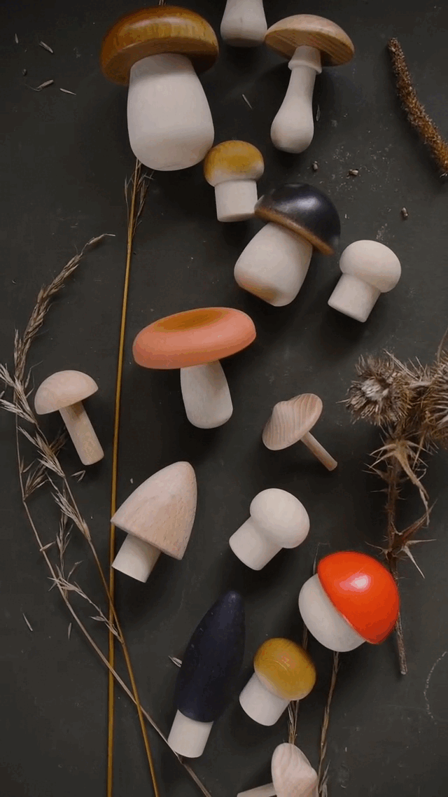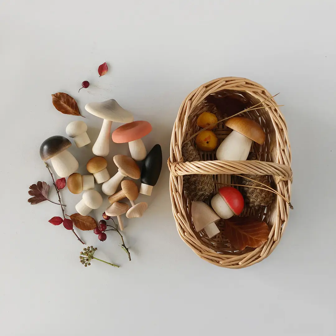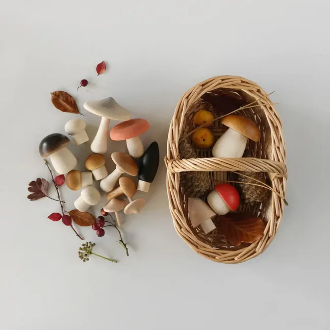 Dieses liebevoll gestaltete Set besteht aus 15 handgefertigten Holzpilzen in einem Korb aus Rattan – perfekt für fantasievolles Spielen, Naturerkundungen oder als hübsche Deko.