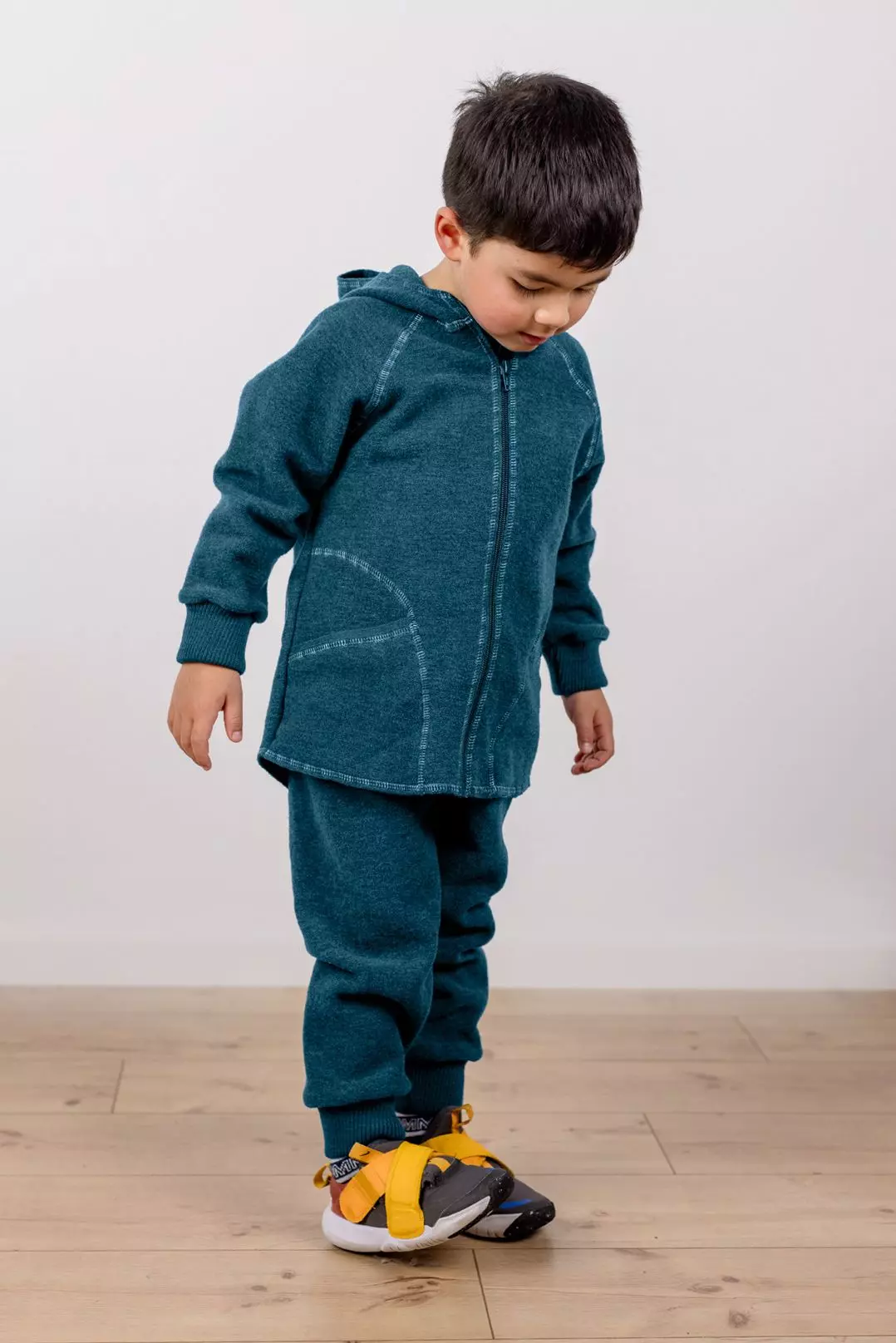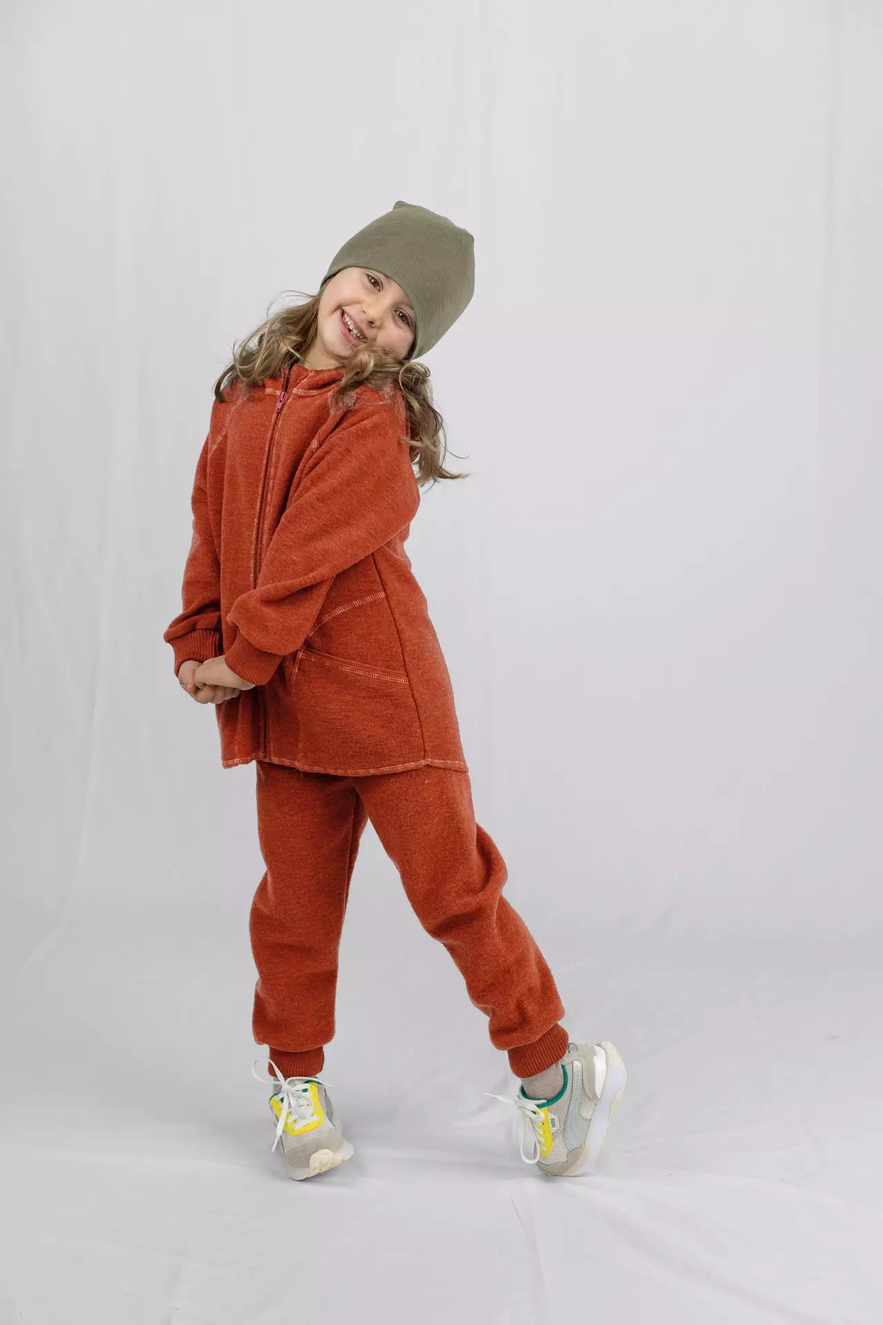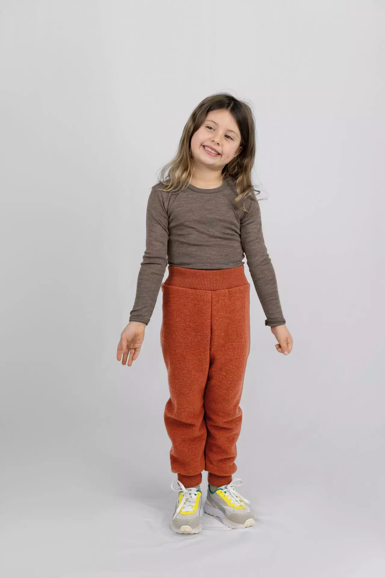 Weiche, warme und zugleich strapazierfähige Walkhose für kleine Entdeckerinnen und Entdecker. Gefertigt aus 100 % Bio-Merinoschurwolle aus kontrolliert biologischer Tierhaltung, bietet sie optimalen Schutz bei kühler Witterung – wind- und wasserabweisend, dabei angenehm atmungsaktiv.