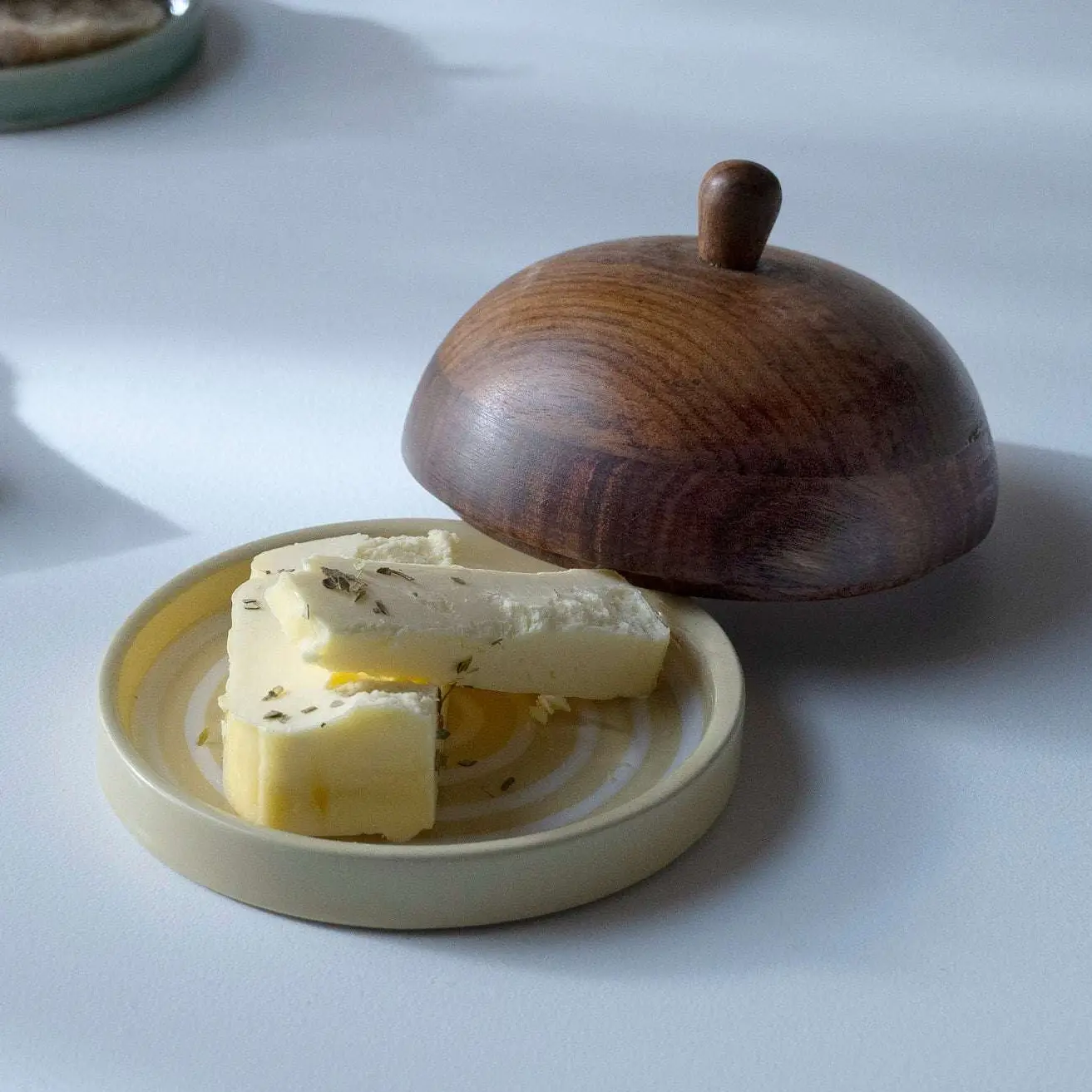 Kleine Butterdose aus Keramik mit Gelb gestreiftem Design