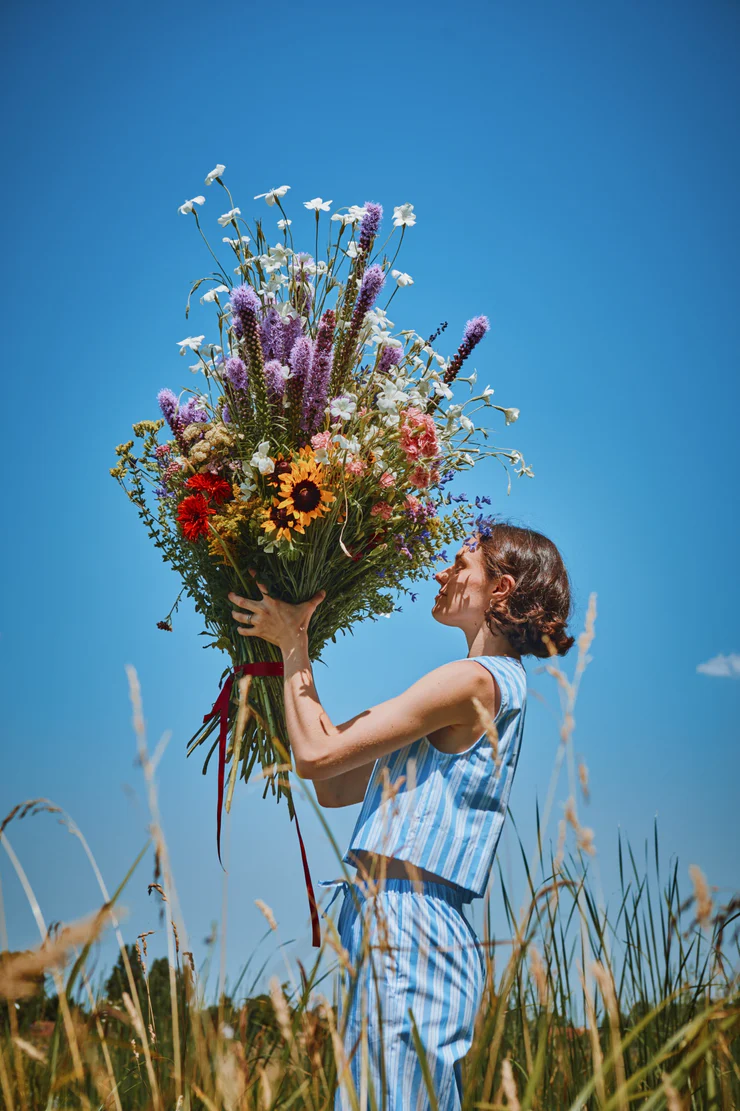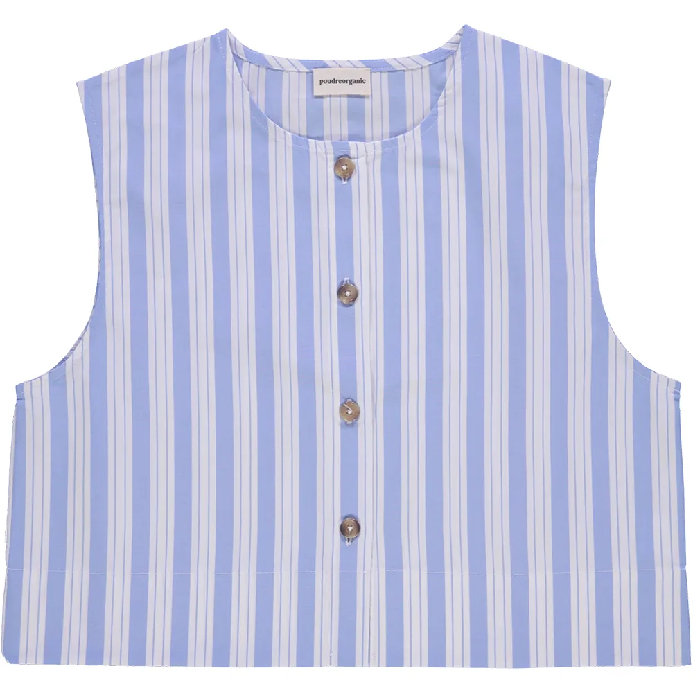 Leicht, frisch und perfekt für warme Tage. Die Blouse sans manches Vanille begeistert mit ihrem zarten Streifenmuster in sanftem Blau und Weiss – ein Look, der sofort an Sommer, Sonne und barfuss durchs Gras erinnert.