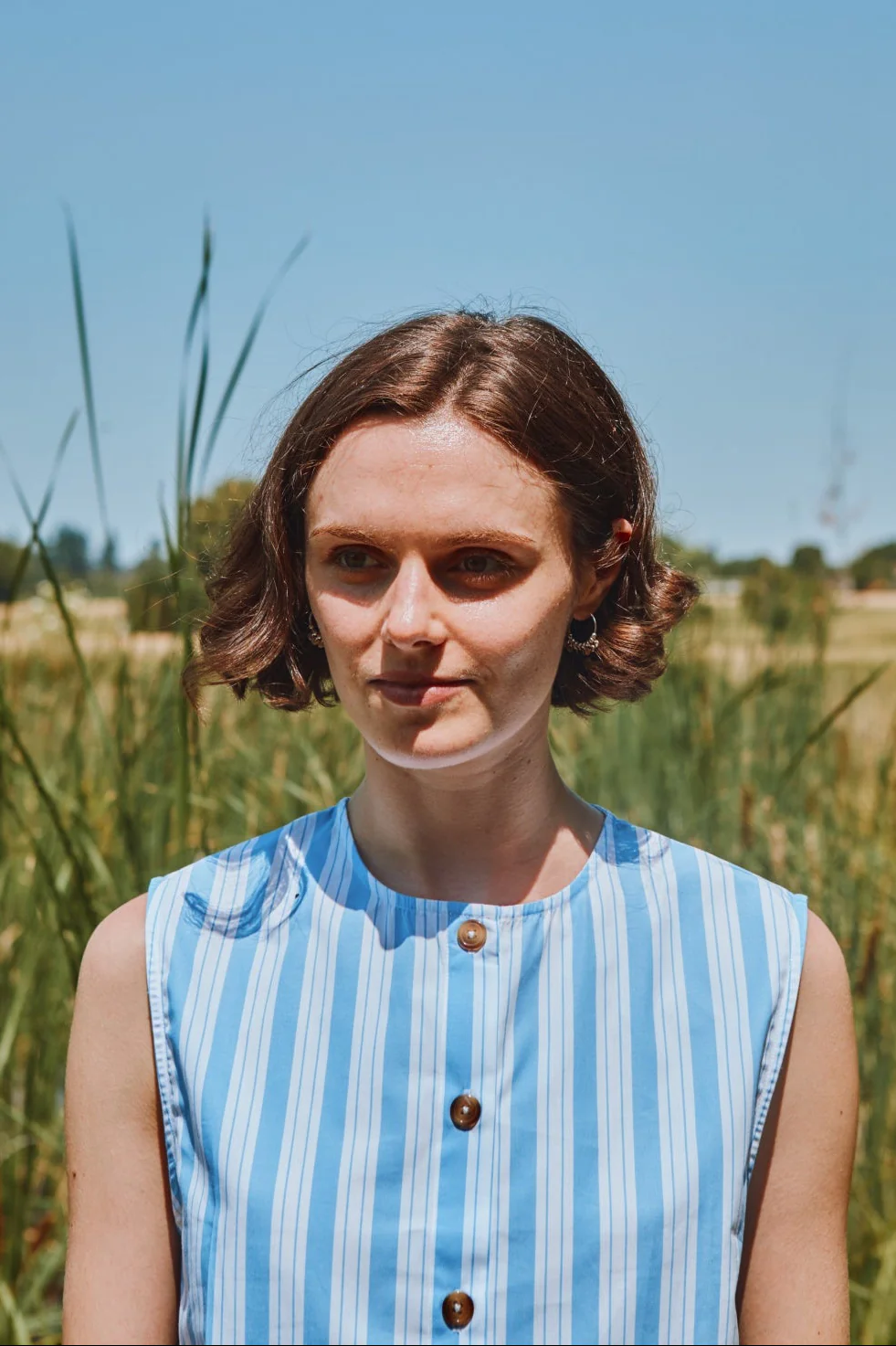 Der Schnitt ist locker und angenehm zu tragen. Ohne Ärmel und mit rundem Ausschnitt wirkt sie schlicht und klar. Hinten sorgt ein kleiner Knopfverschluss für ein feines Detail und erleichtert das Anziehen. Der leichte Baumwollstoff fühlt sich weich auf der Haut an und bietet viel Bewegungsfreiheit – ideal für aktive Tage draussen.